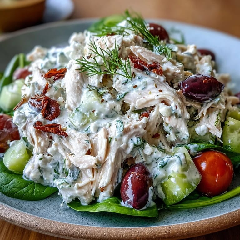 I learned early on that this salad improves over two to three days as the flavors have time to integrate and mellow together. Day-one is fresh and bright, but day-three is when the tzatziki has truly embraced the chicken and everything tastes like it was meant to be together. Keep it in an airtight container and it stays excellent through lunch hour; the dressing protects the chicken from drying out, which is a huge advantage over traditional salads.